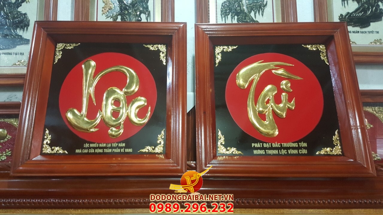 Tranh chữ TÀI , LỘC được làm thủ công bằng đồng vàng và được dát vàng sang trọng , khung gỗ tự nhiên